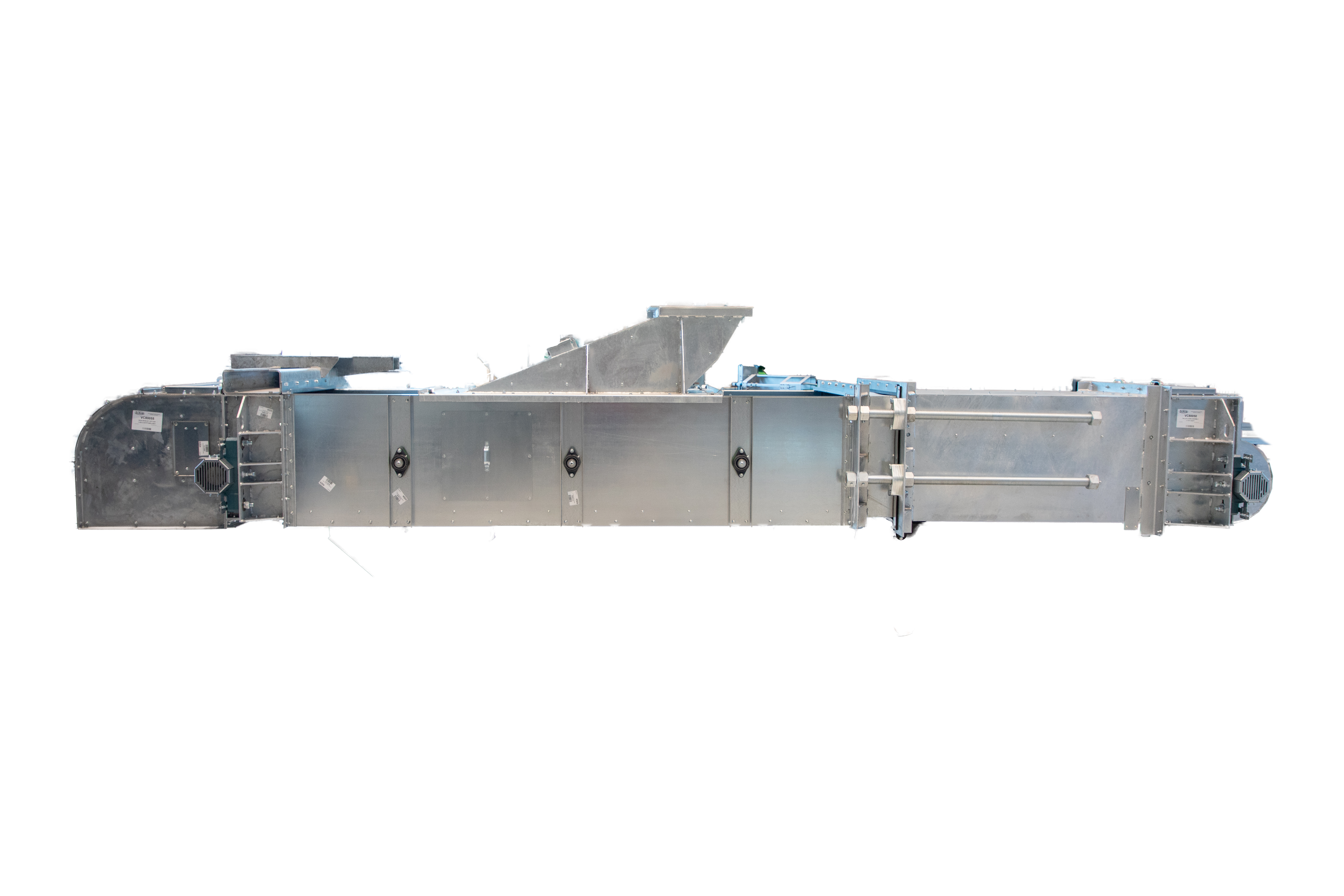 For maintenance efficiency, the enclosed conveyor includes a large service door, hinged inspection doors, bearing guards, and multiple liner options. The head section incorporates a slide-lagged head pulley with a lagging replacement door, plus an optional two-way discharge. The tail section features a self-cleaning herringbone reloading tail pulley and a plow to direct grain. A 42" telescoping take-up with a 2" acme threaded rod, 1½" leveling rods, and antistatic UHMW rails ensures accurate belt tensioning.